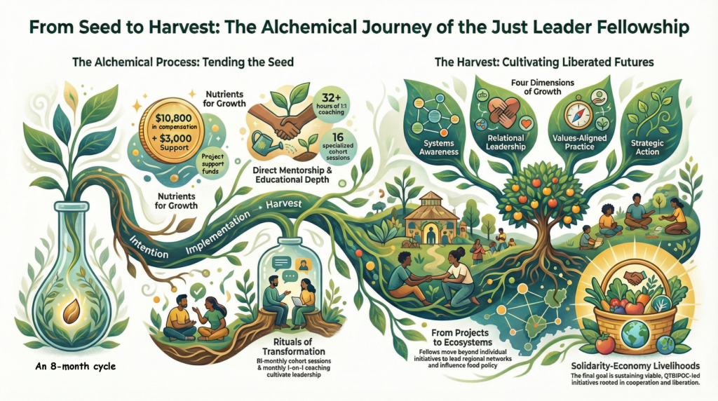 The Just Leader Fellowship is a container of transformation and alchemy. A place where political education becomes illumination. Where technical skill becomes empowerment. Where leadership becomes embodied and cooperative. And where each Fellow’s project becomes a site of community healing and sovereignty.